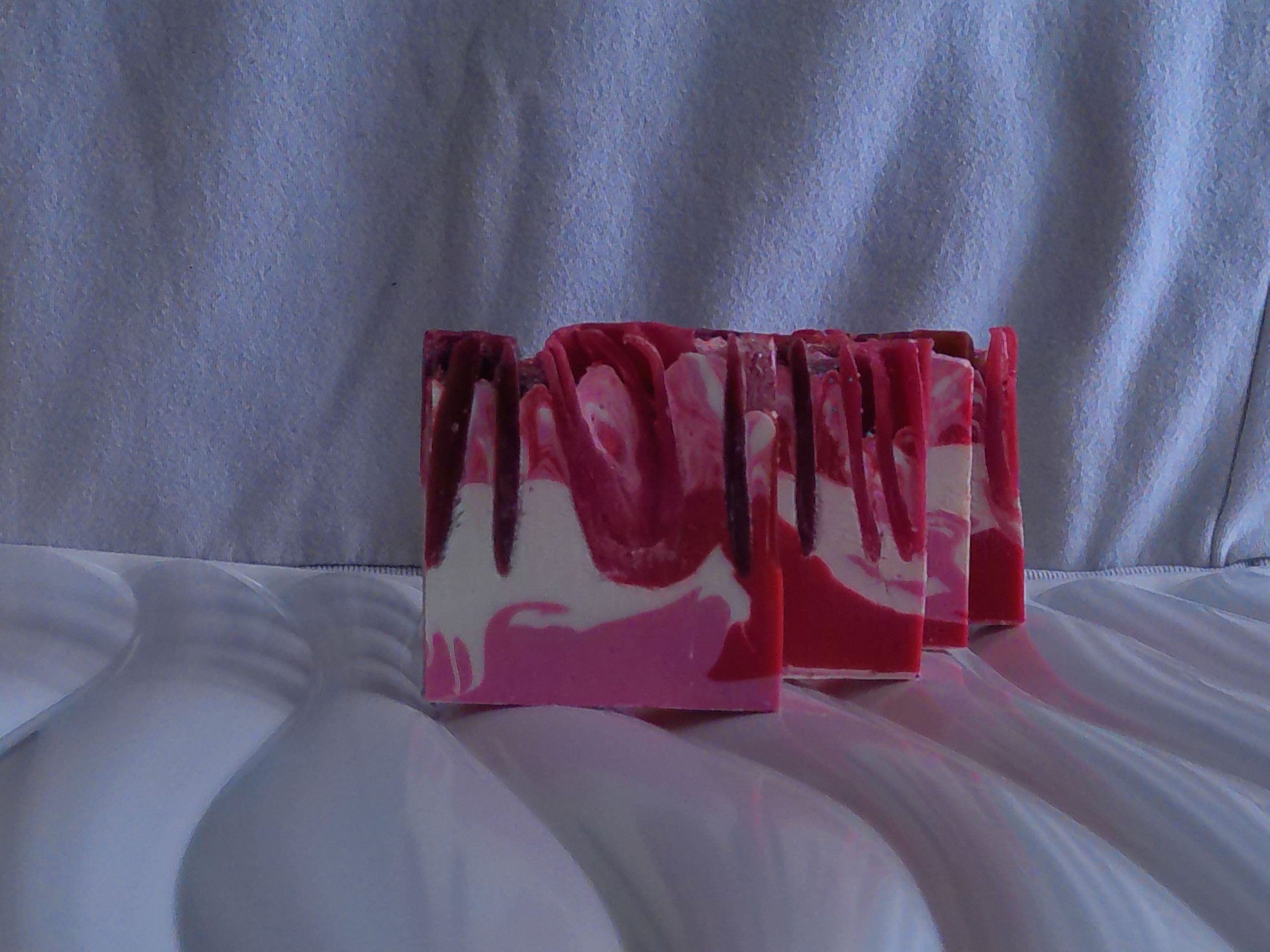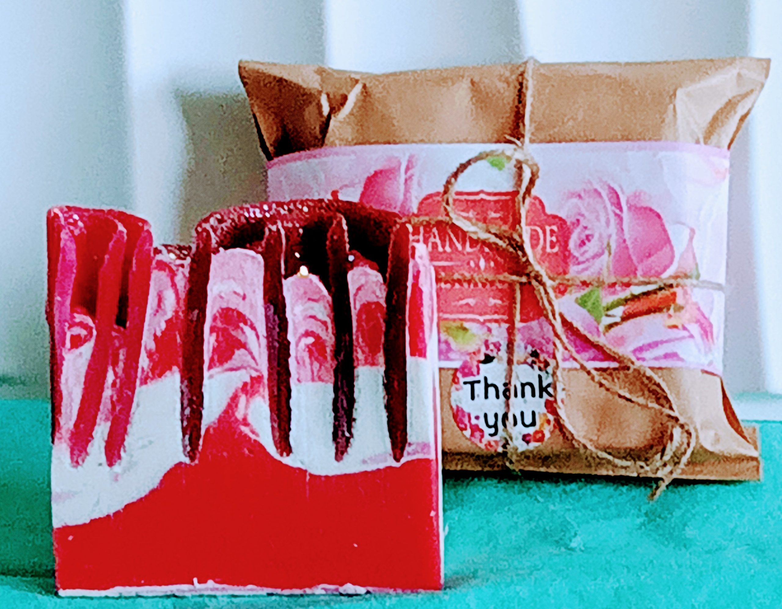 1pc Rose Ravissante soap bar is made with purified water and saponified oils of organic olive, organic coconut, palm, shea butter, fragrance oils, zinc oxide, mica and cosmetic glitter